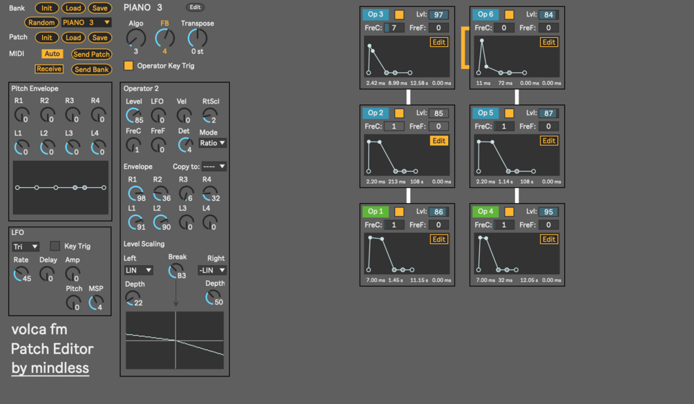 This Max For Live device lets you create, edit, import and export patches for the Volca FM and DX7. My goal is to build an editor that really helps you understand what is going on and take advantage of the amazing sound shaping potential of these machines.